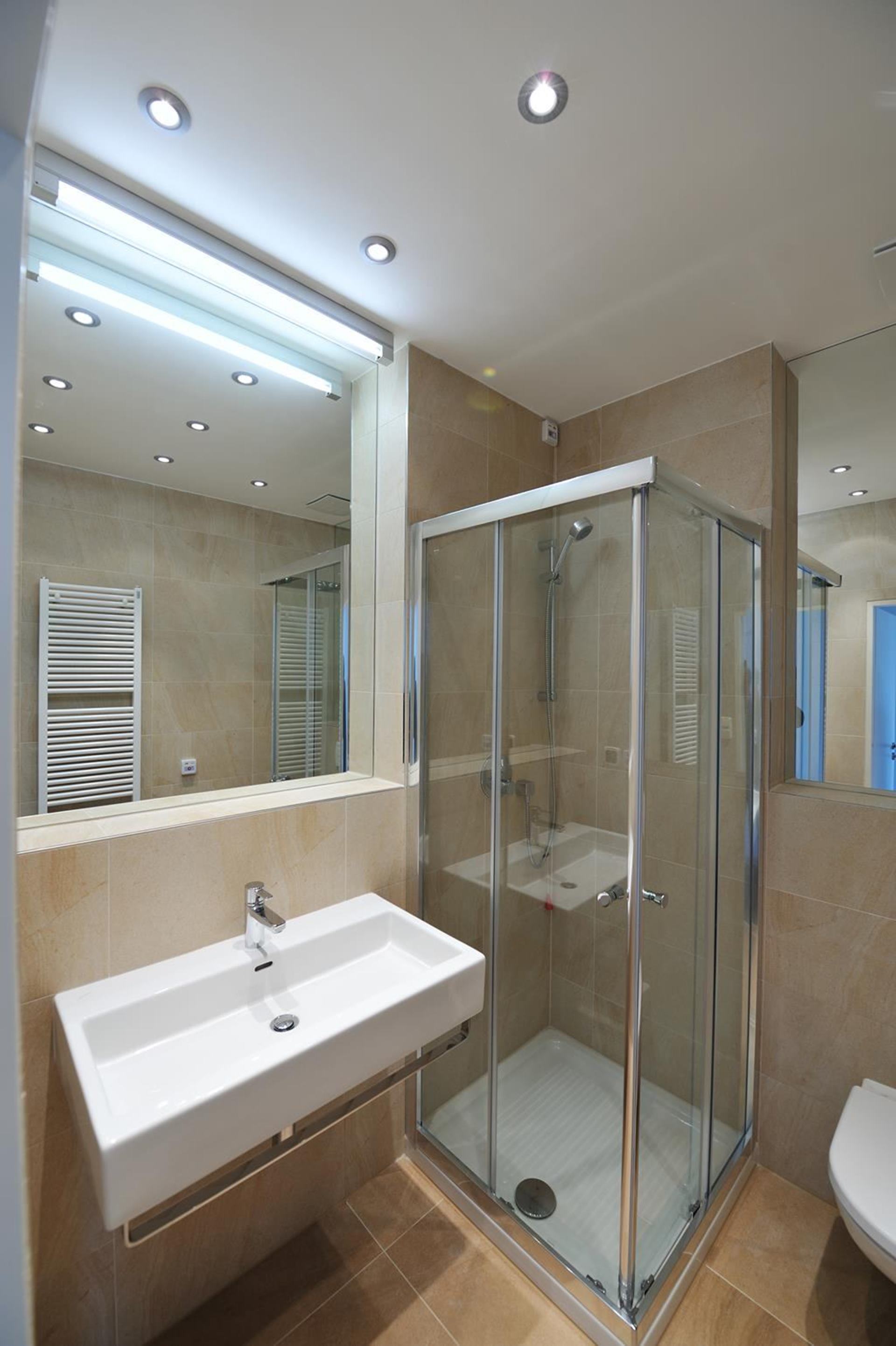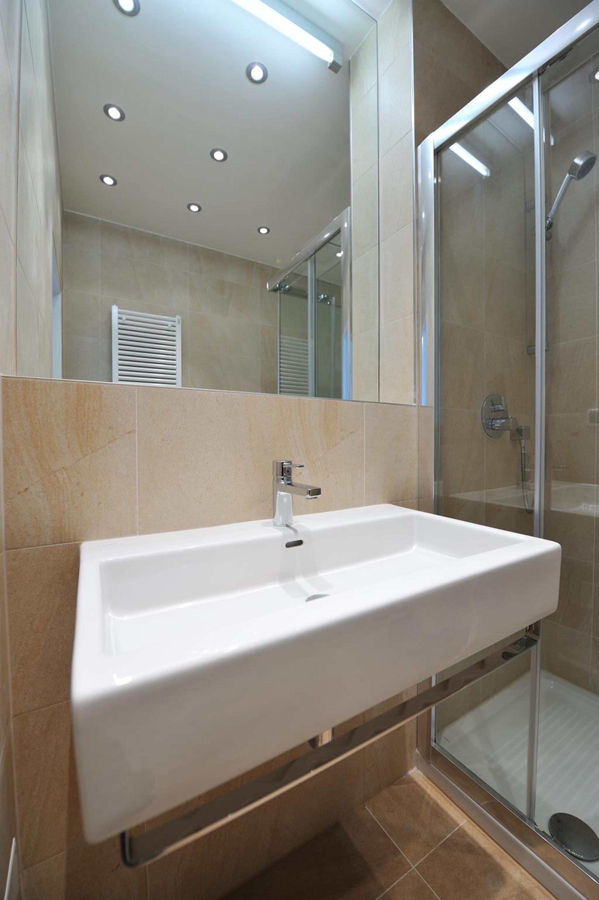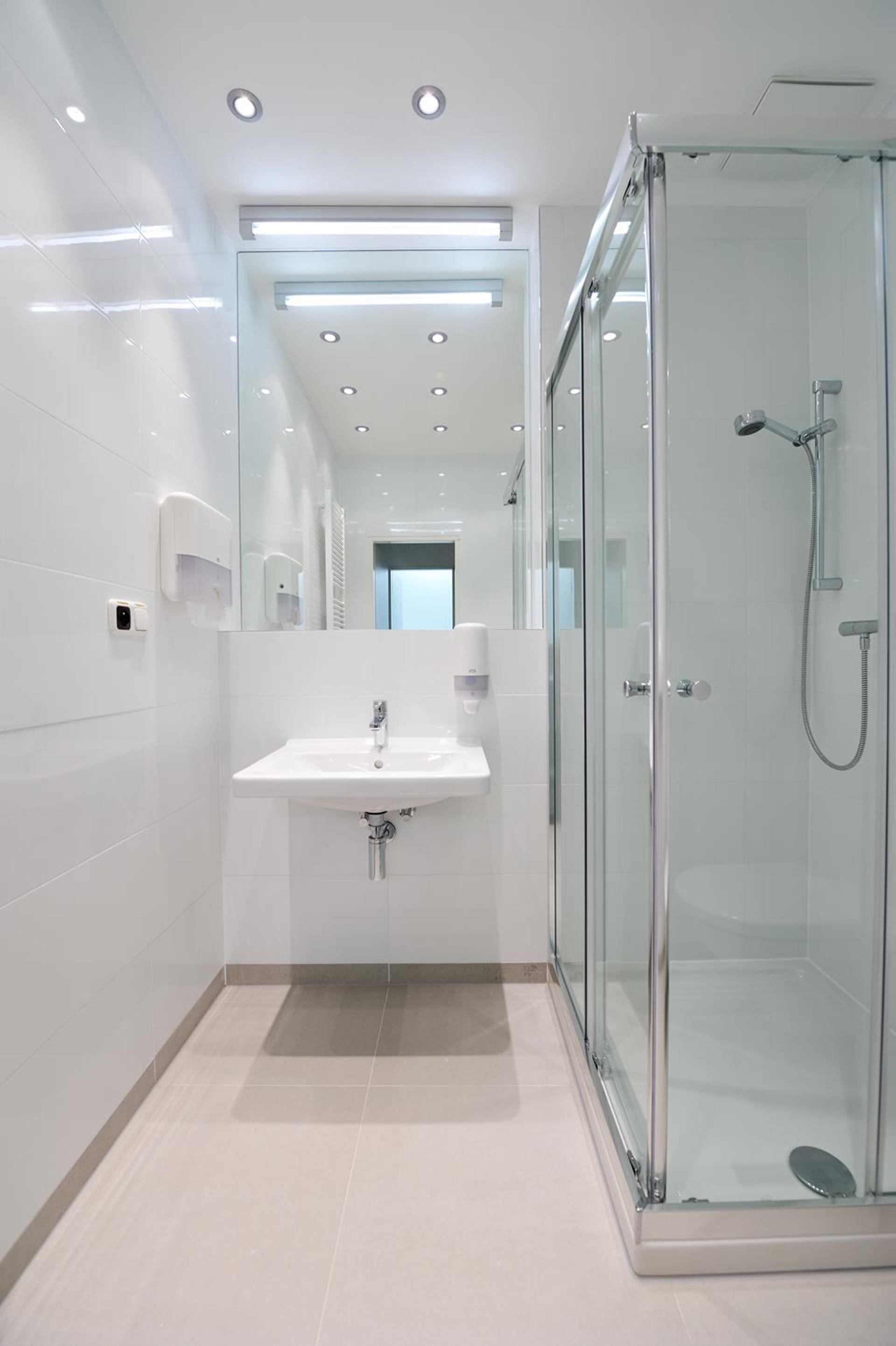 Minimalistická biela kúpeľňa na Avelane clinic so sprchovacím kútom a umývadlom