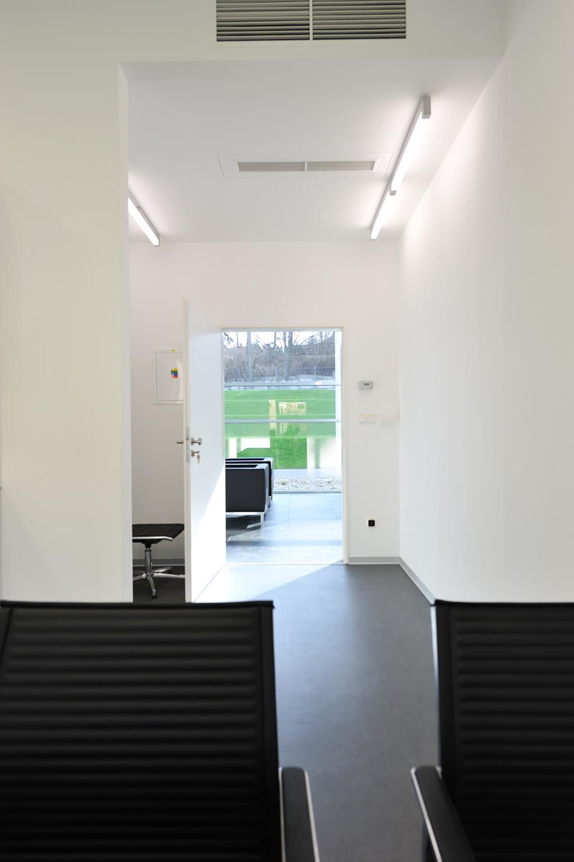 Vstup do konzultačnej miestnosti na Avelane clinic s čiernymi stoličkami
