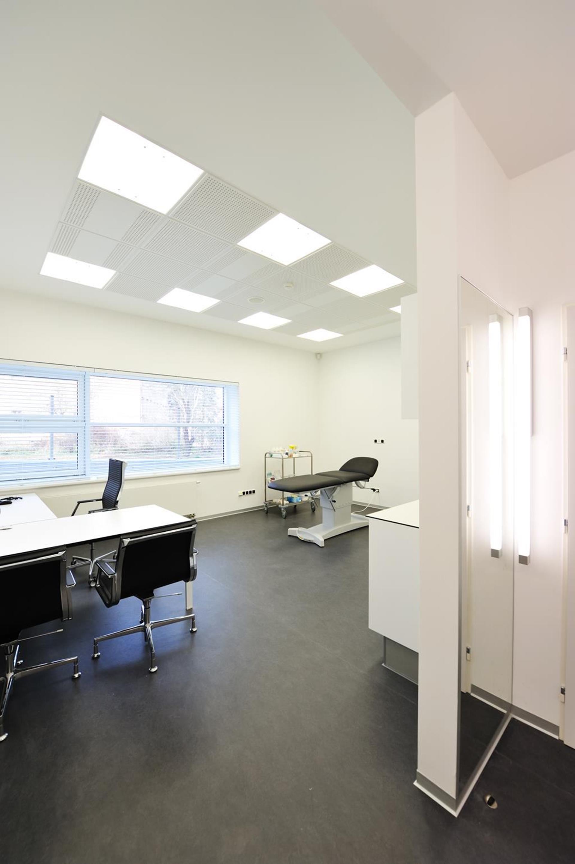 Konzultačná miestnosť na Avelane clinic s veľkými oknami a pracovným stolom