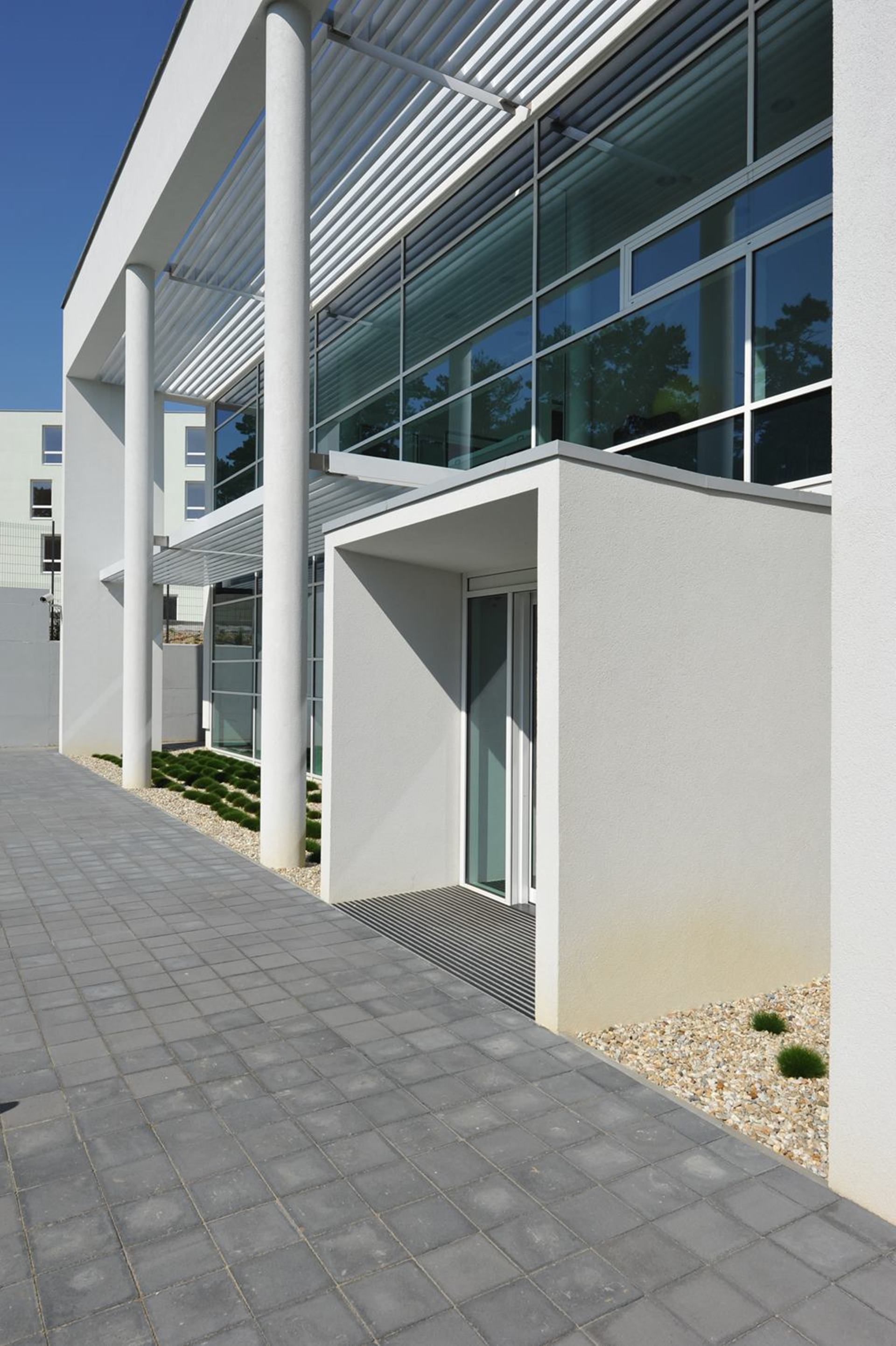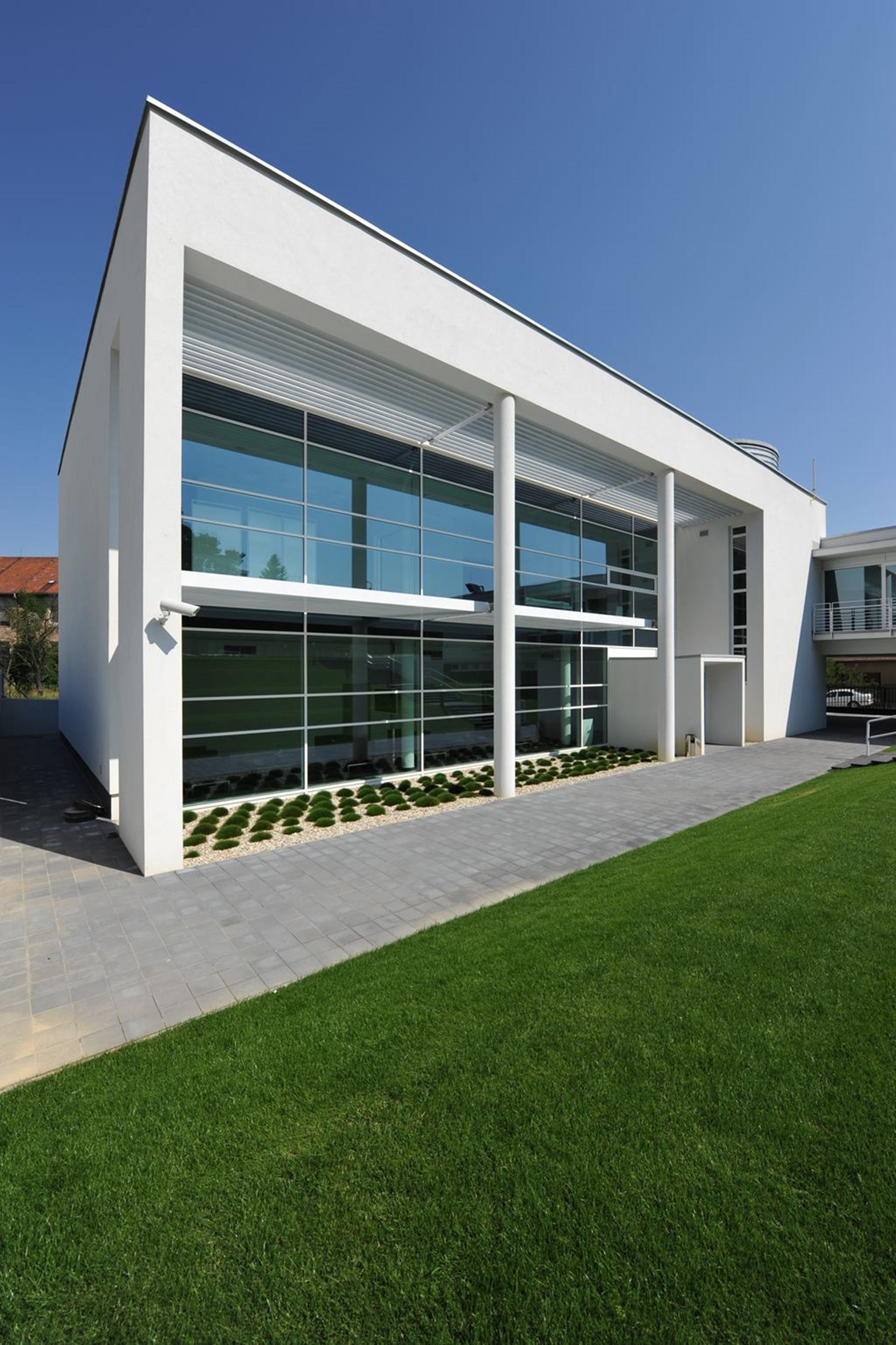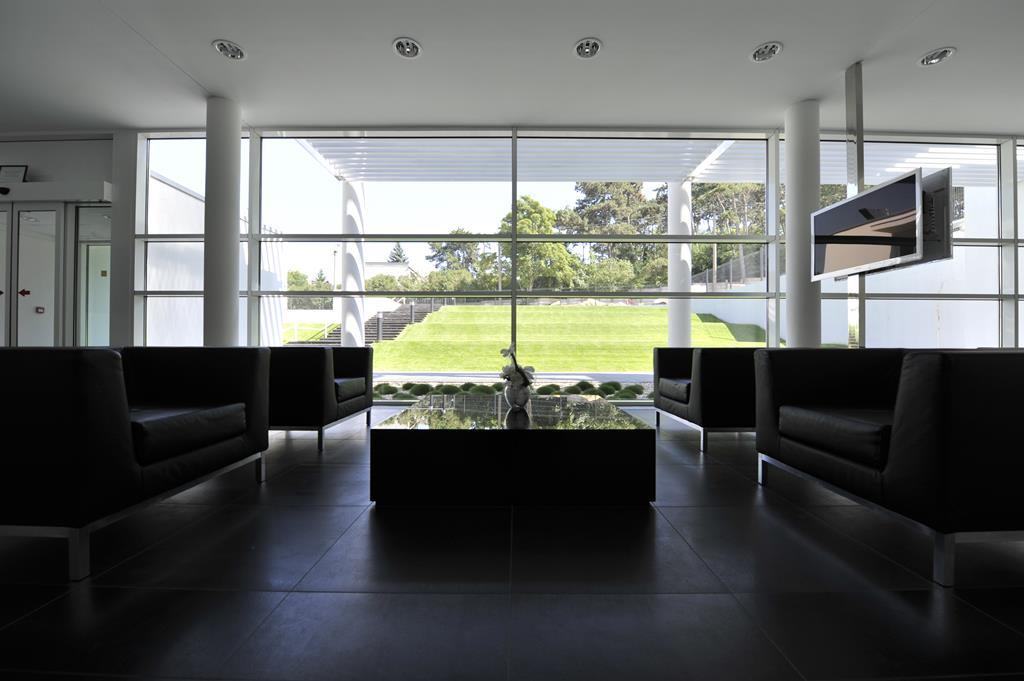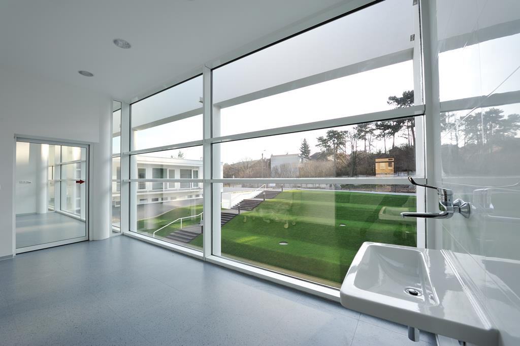 Chodba Avelane clinic s veľkými presklenými stenami a výhľadom na exteriér