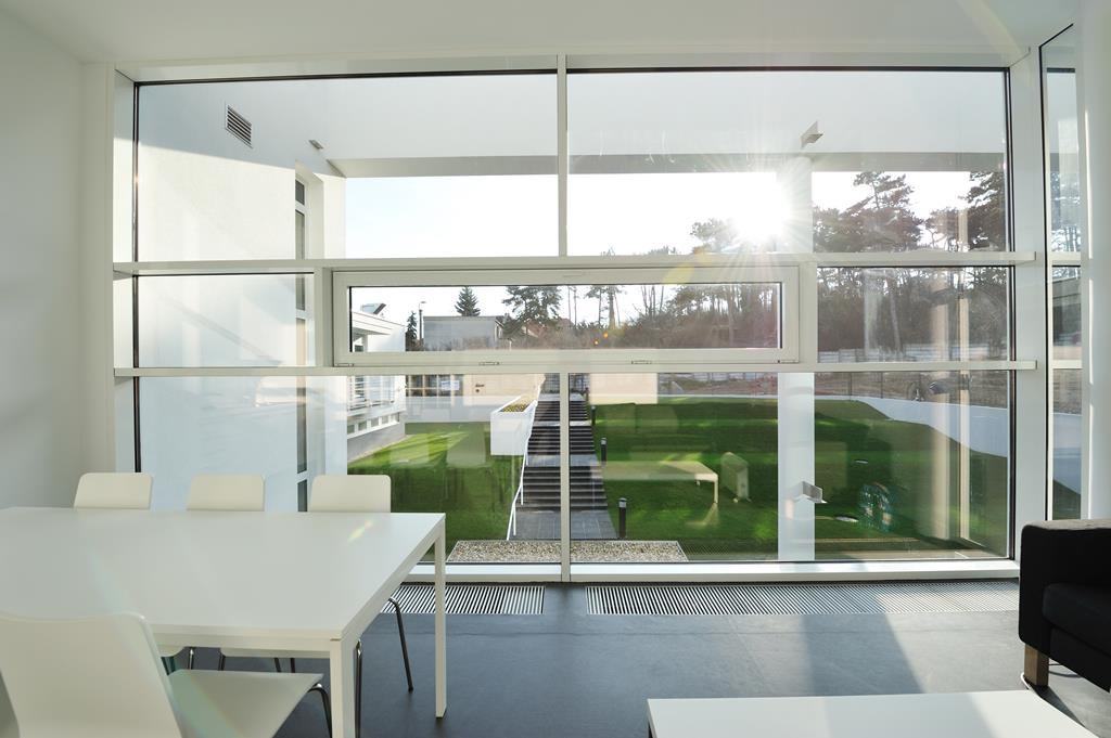 Moderná jedáleň na Avelane clinic s presklenou stenou a výhľadom do exteriéru