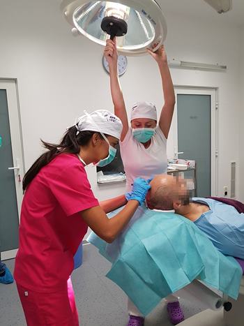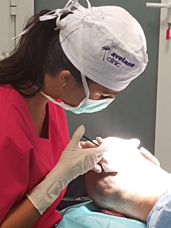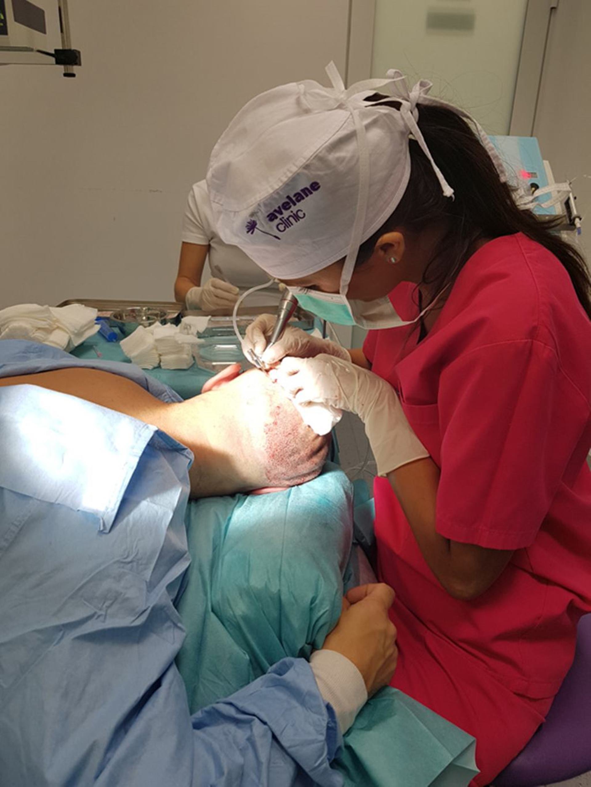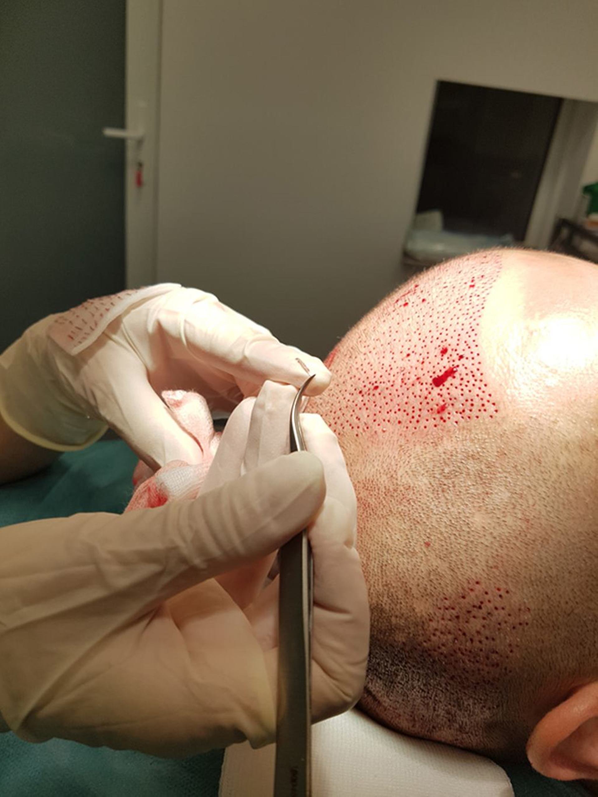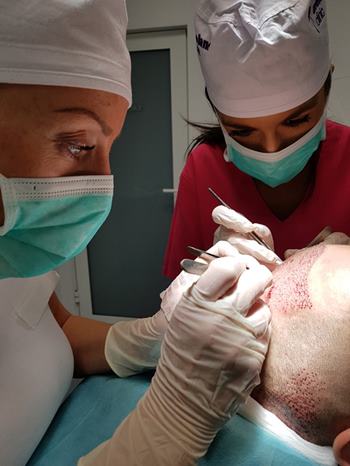 Pre samotným zákrokom je potrebná vstupná konzultácia, poprípade trichologické vyšetrenie vlasov, aby sme zistili, či máte dostatočnú odberovú plochu, aký máte typ a stupeň plešatosti a do akej miery môžete ďalej plešatieť. Sledujeme, či máte dostatočný počet štepov v odberovej oblasti. Na začiatok vám oholíme odberové miesto a podáme lokálnu anestézu. Následne začneme s odberom štepov. Štepy umiestnime do malej zbernej nádobky, kde ich neustále zvlhčujeme špeciálnym sterilným roztokom, aby sme zabezpečili ich maximálnu životaschopnosť. Tento proces môže trvať v priemere 2 hodiny, niekedy aj dlhšie. Keď už máme dostatok štepov, začneme s prípravou implantačnej oblasti. Miesto, kam budeme štepy premiestňovať, znecitlivieme a začneme s dierkovaním. Do dierok budeme na záver implantovať vlasové štepy. Tento proces je opäť veľmi časovo náročný. Vy ale nemusíte mať žiadne obavy, pretože pri celom zákroku budete pohodlne ležať a nebudete cítiť žiadne bolesti. Po transplantácii je bežné že prvé 3 mesiace vlasy vypadávajú. Konečný efekt je viditeľný až po roku. V prípade, ak by ste si želali miesto zahustiť ďalšími vlasmi, je to možné až rok po prvej transplantácii.